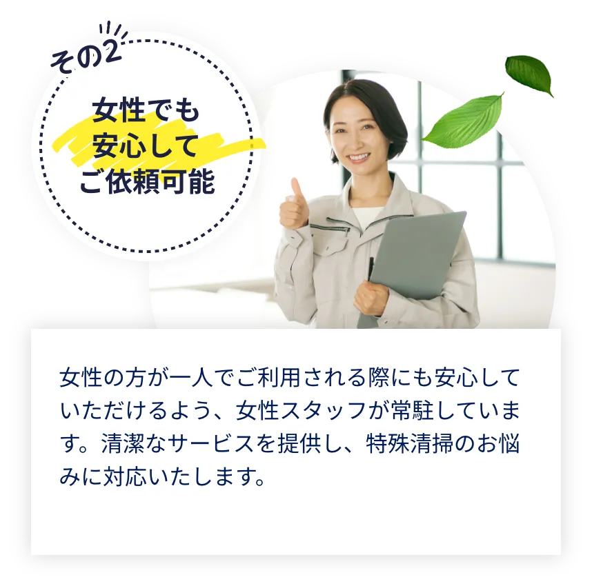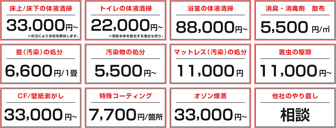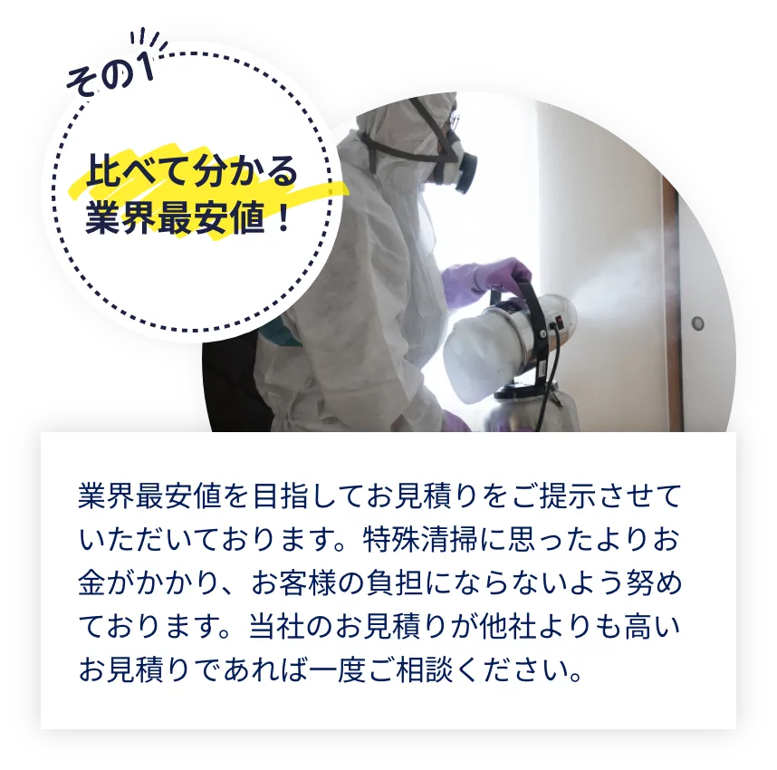 清掃費用は、間取りの広さや汚れの程度、必要な作業時間などによって変動いたしますが、当社ではご検討段階から無料でお見積りをお出ししております。まずはお気軽にお問い合わせいただき、お客様のご要望や不安に寄り添いながら現状を丁寧にヒアリングし、状況に最も適したプランと料金を分かりやすくご提示いたしますので、安心してお任せください。